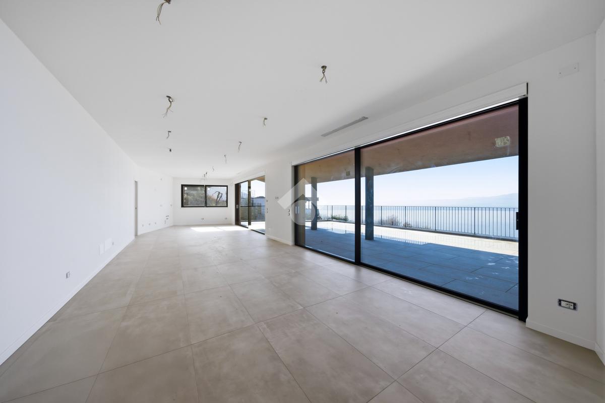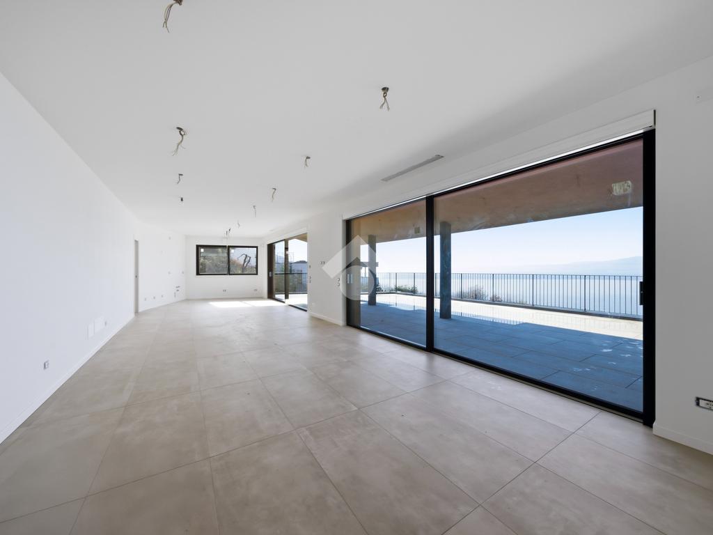 Il luminoso e spazioso living, caratterizzato da grandi vetrate, si apre direttamente sul terrazzo panoramico che domina il lago, creando una perfetta continuità tra interni ed esterni.